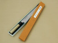 Damastmesser Sashimi aus Ginsan Silver-3 Stahl und 33 Lagen Damaststahl. Hergestellt von Meister Suogo Yamatsuka, der bekannt dafür ist, außergewöhnliche, japanische Messer zu produzieren. Er hat sich auf die Verarbeitung von Ginsan Silver-3 Stahl spezialisiert. Die Messer sind korrosionsbeständig und haben ein extrem hohes Schärfepotenzial. Das Messer ist beidseitig geschliffen, hat einen Vollholz Griff aus Magnolie und eine Zwinge aus Büffelhorn.