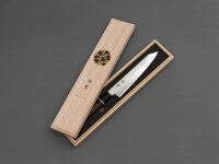 möglich sind. Weitere Bestandteile sind 15% Chrom, 3% Molybdän und 2% Vanadium. Mit diesem Schneidkern bieten die Messer der Serie Zuiun eine außergewöhnlich hohe Schärfe, Schneidleistung und Beständigkeit und übertrifft sogar den Premiumstahl VG-10. Umhüllt ist der Schneidkern von 62 Lagen Damaststahl. Der Messergriff besteht aus unempfindlichen und pflegleichten Holzlaminat, achteckig, mit dekorativer Metallverzierung. Ganz besondere Aufmerksamkeit hat auch die Form der Messer und der Messerschliff verdient. Alle Zuiun Messer sind leicht konvex geschliffen, was den Klingen Stabilität, Haltbarkeit und ein überaus angenehmes Schneidverhalten gibt. Dieser Schliff leitete die Kanetsugu Cutlery aus den traditionellen japanischen Schwertern ab, die der Schwertschmied Kanetsugu bereits im 14’ten Jahrhundert schmiedete. Bekannt sind die Messermacher aus Seki für die konsequente Verbindung von traditionellen Fertigungsmethoden mit Hightech, sowohl in der Fertigung als auch in der Materialwahl. Diese japanischen Kochmesser sind also wie die berühmten Katana kreiert und bieten, ähnlich wie die Samurai-Schwerter, außergewöhnliche Schärfe und Haltbarkeit. Außerdem sind sie auch, dank dieser Schleifform, leicht zu schleifen.
