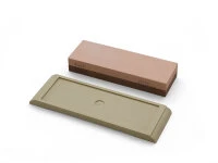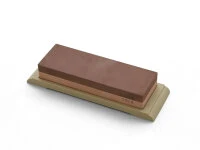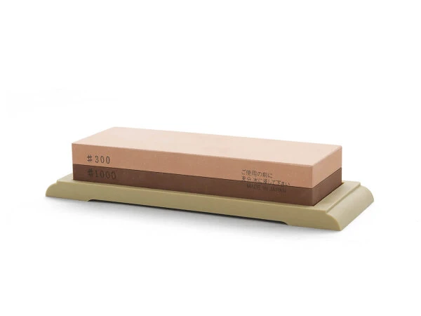 Japanischer Wasser-Schleifstein mit zwei Körnungen nach JIS-Japan. Inklusive einem Schleifsteinhalter aus Kunststoff. Körnung 300: geeignet für den Vorschliff (Grobschliff) und Schruppen. Körnung 1000: für das Schärfen der Messer. Es handelt sich um einen synthetischen Stein, der aus Aluminiumoxid, Feldspat und Siliciumdioxid besteht – wie bei japanischen Schleifsteinen üblich. Der Stein ist eine Empfehlung einer unserer Messer-Schmieden und ist für alle japanischen Messer-Stähle verwendbar. Je nach eigenem Anspruch ist eine Ergänzung mit eine Schleifstein mit feinerer Körnung – 2000 oder feiner – als Shiage (Abziehstein, Finishing Stein) sinnvoll. Bitte beachten Sie bei Verwendung die beigelegten Tipps.